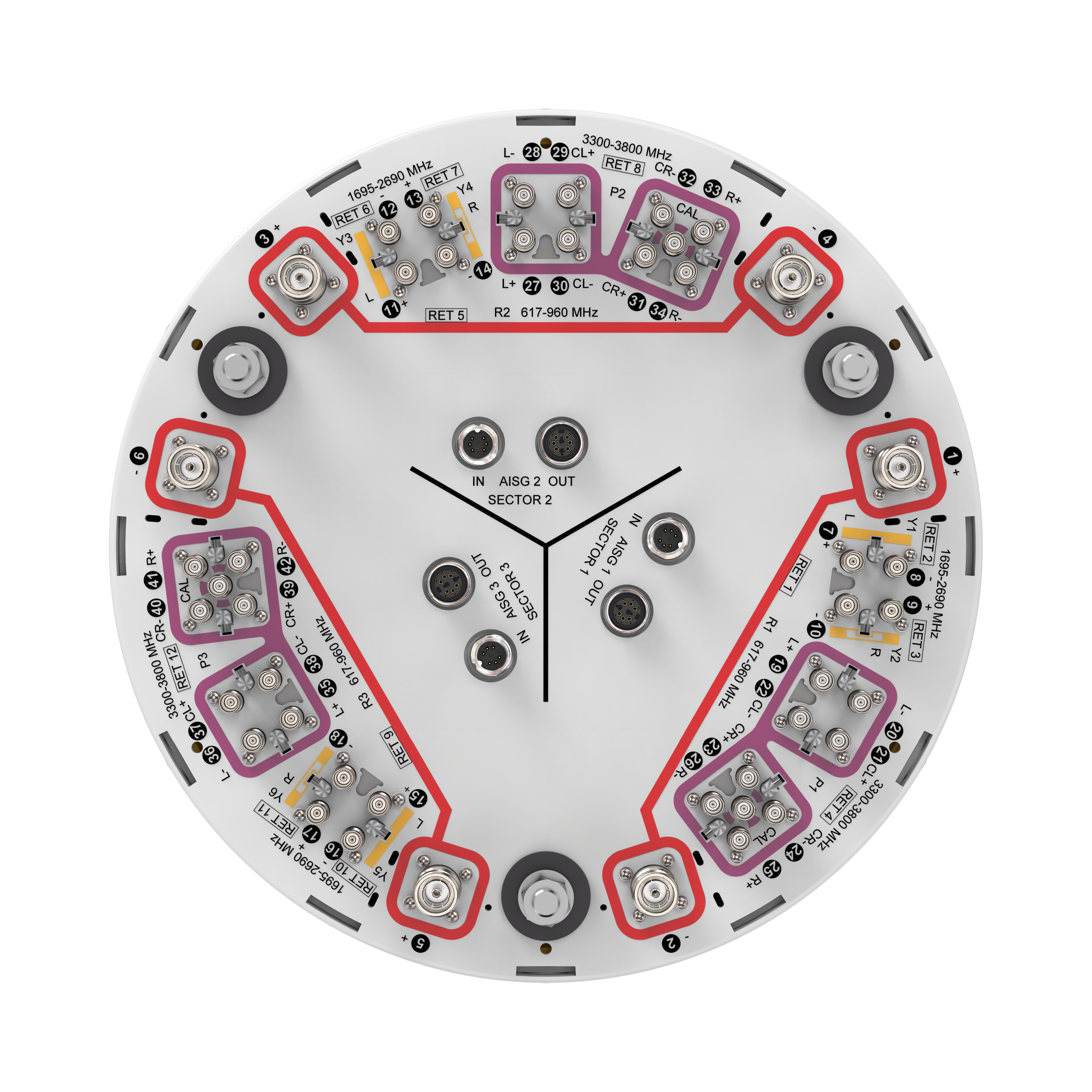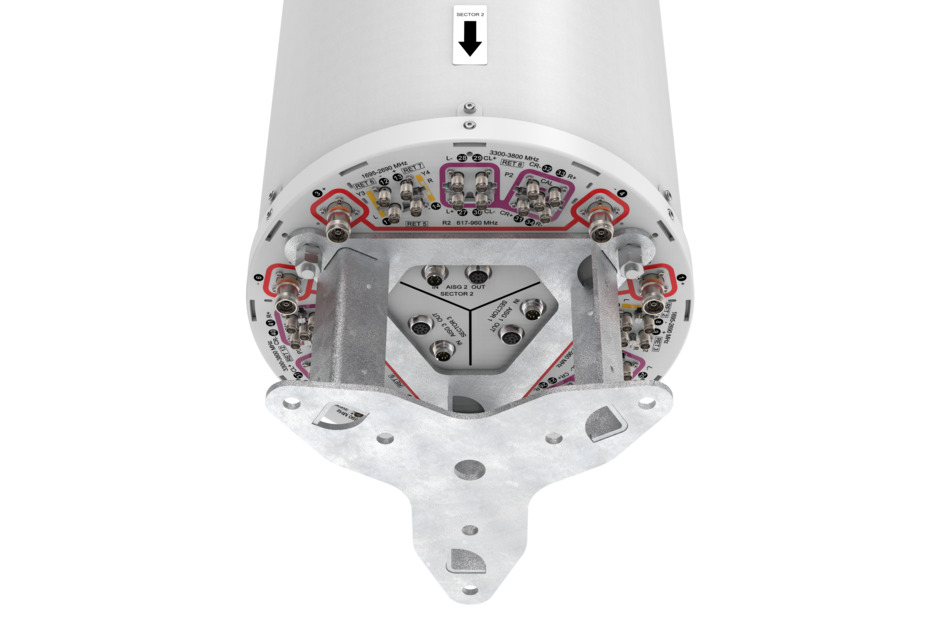 42-port tri-sector antenna, 6x617-960, 12x1695-2690MHz, 65°HPBW, 24x3300-3800MHz Beamformer, 12x RET
