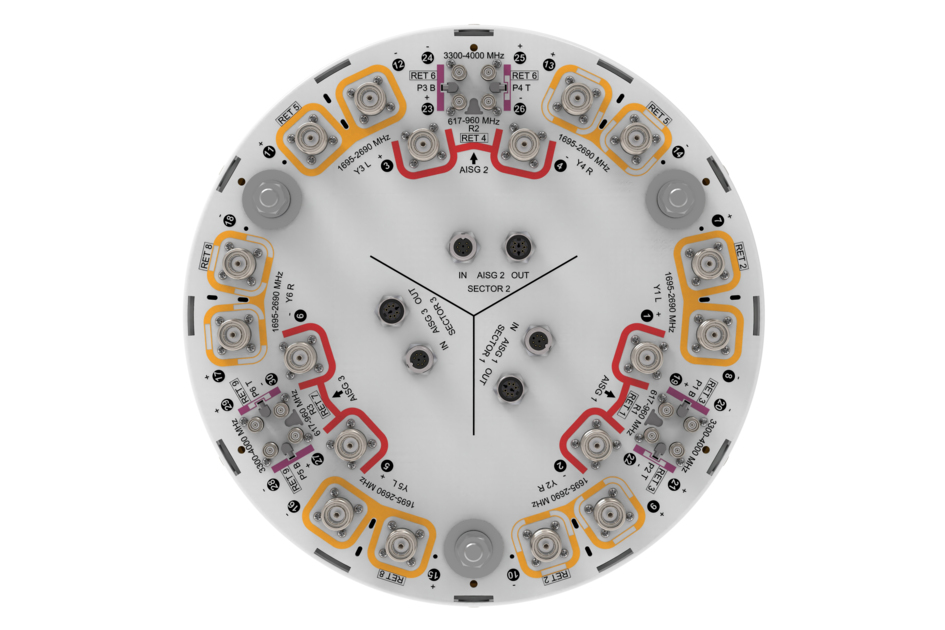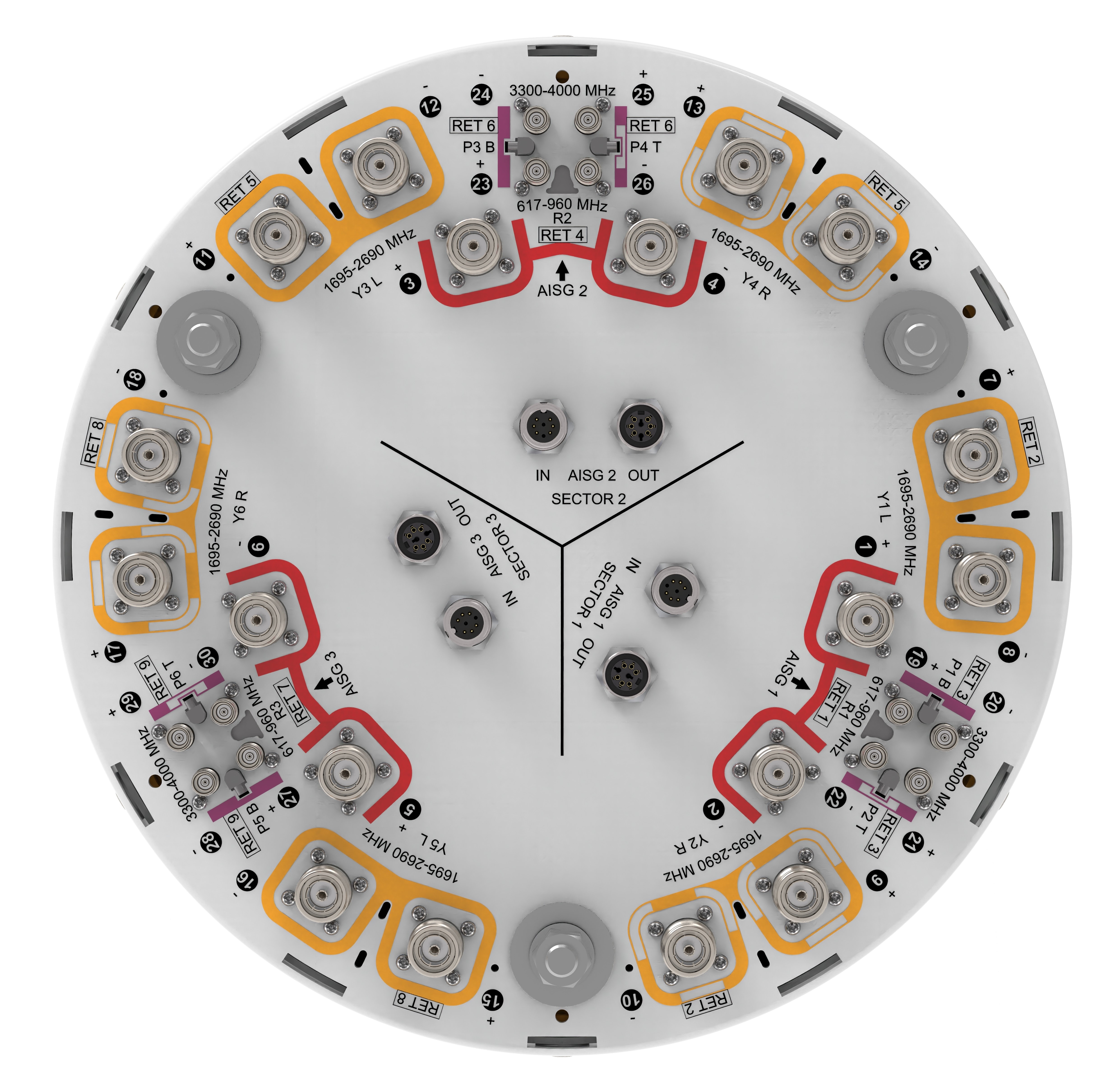 30-ports tri-sector antenna, 6x 617-960, 12x 1695-2690 and 12x 3300-4000 MHz, 65° HPBW, 9x RETs.