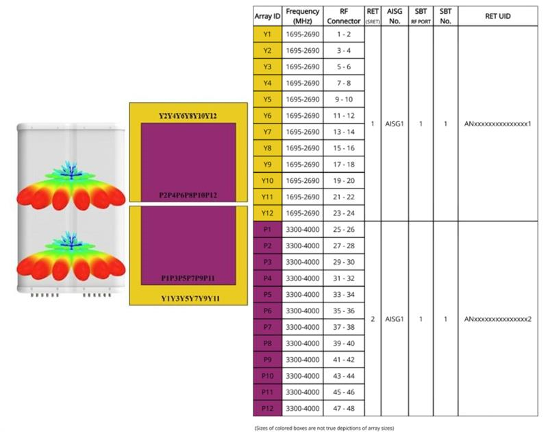 48 Port multibeam ultra-high capacity antenna, 6 beams for 1695-2690 MHz, 6 beams for 3300-4000 MHz, 4 ports for each beam,1 RET per band