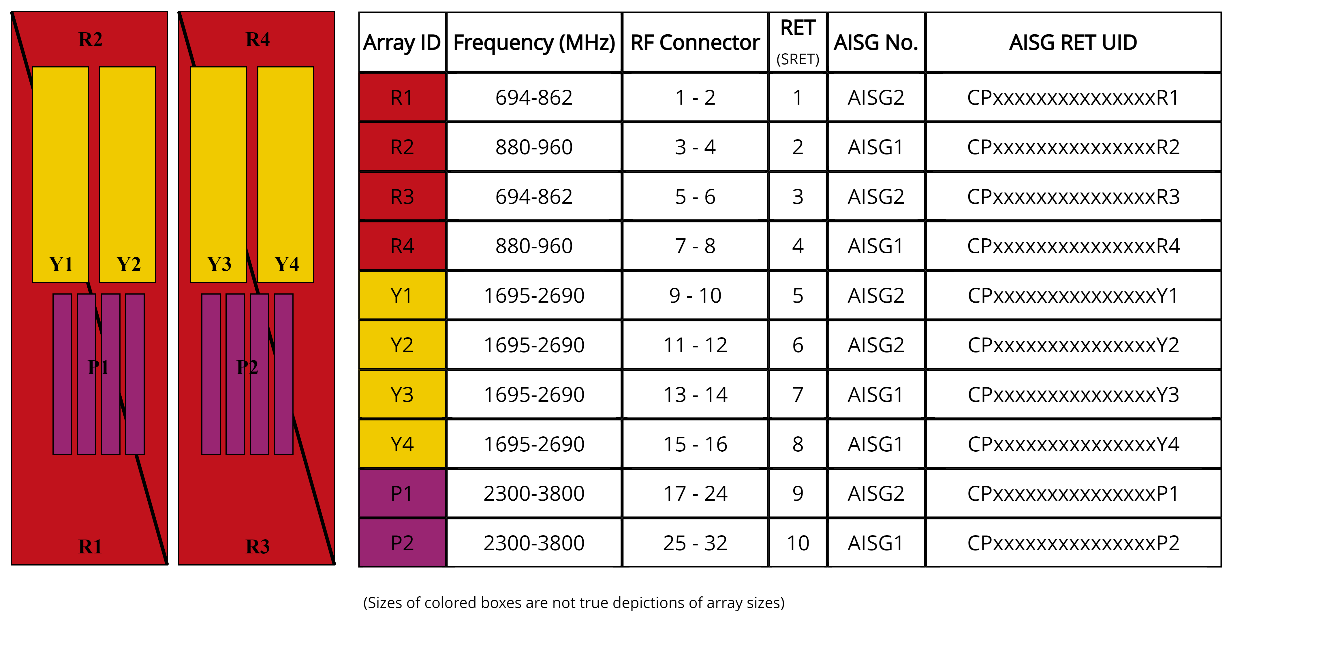 | Internal RET | High band (2) | Low band (4) | Mid band (4) |