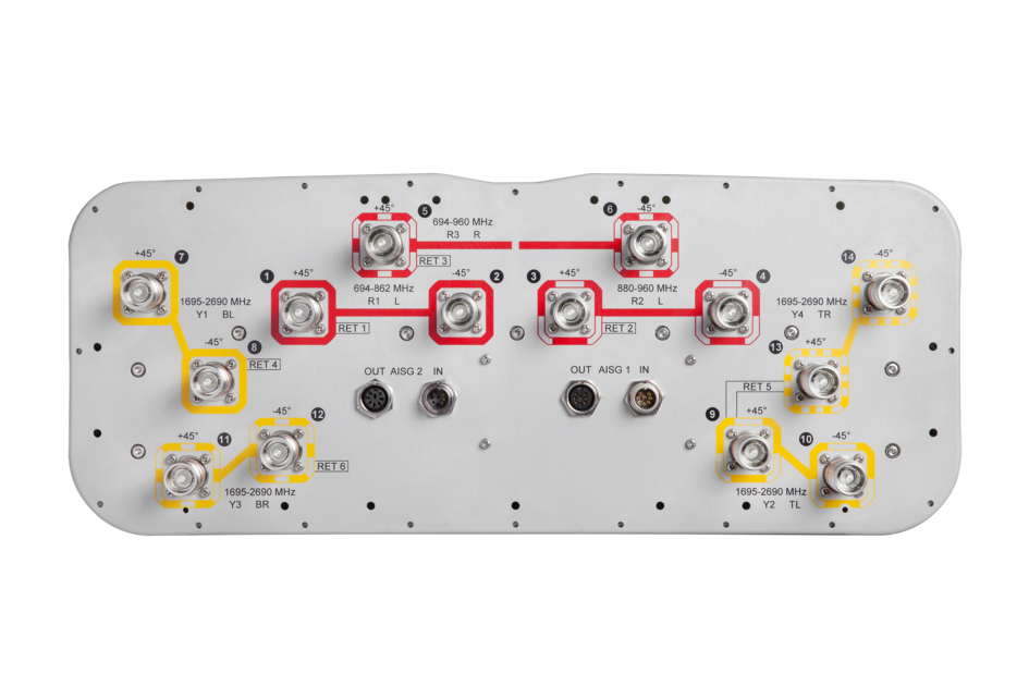 14-port sector antenna, 2x 694–862, 2x 880-960, 2x 694-960 and 8x 1695–2690 MHz, 65° HPBW, 6x RET