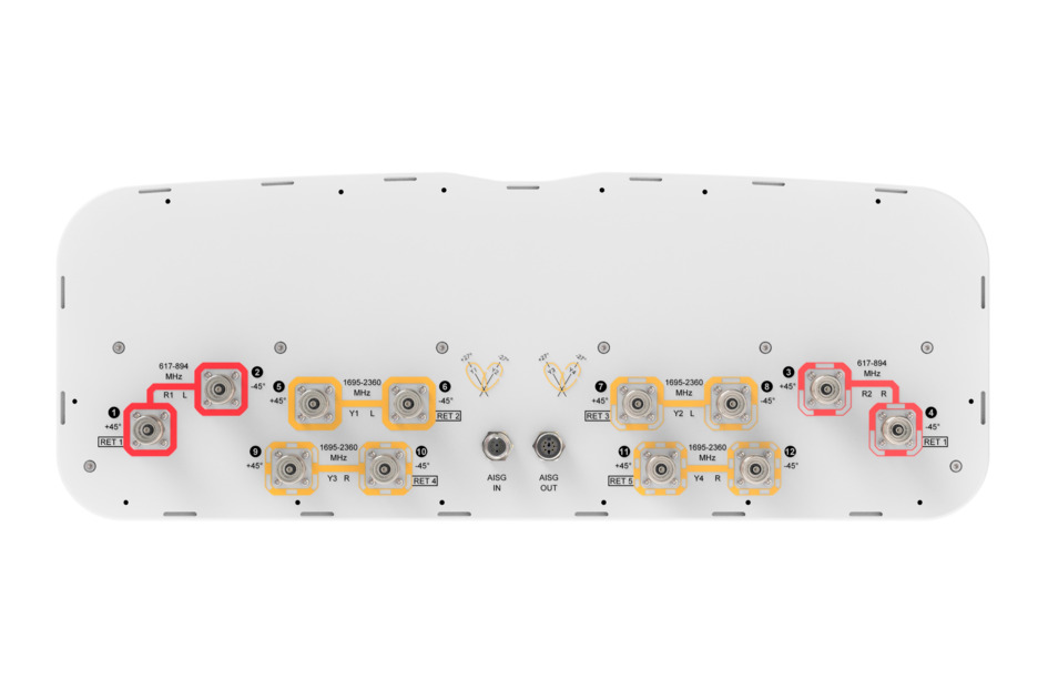 12-Port Sector/multibeam antenna, 4x 617–894 MHz 65° HPBW and 8x 1695–2360 MHz 4x 33° HPBW, 5x RET