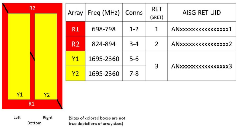 • One RET for 700MHz, one RET for 850MHz, and one RET for both high bands to ensure same tilt level for 4x Rx or 4x MIMO