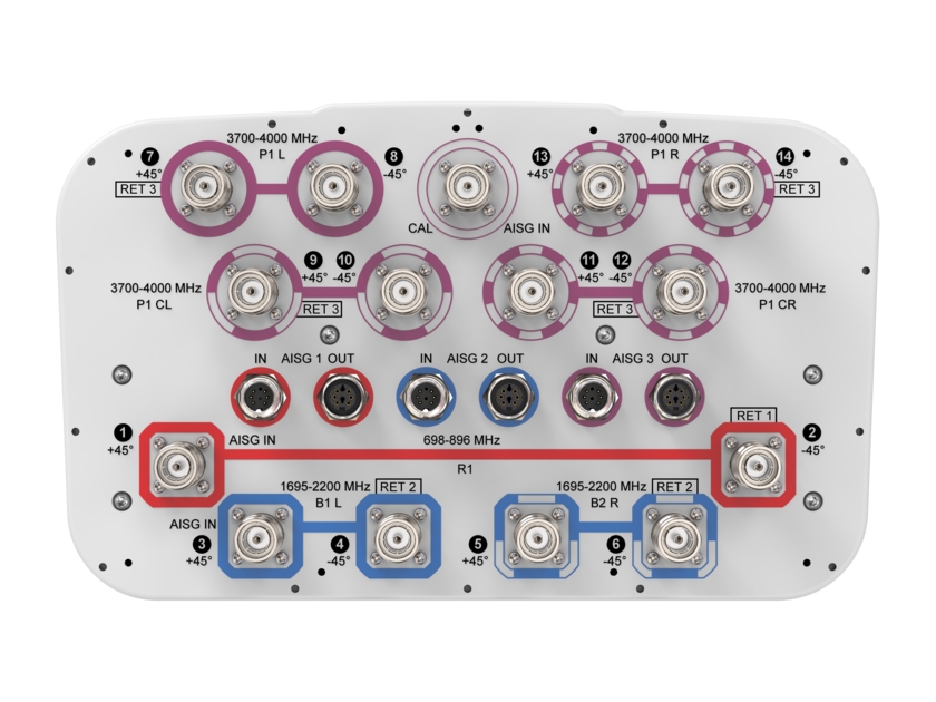 14 Port Sector Antenna, 2x698-896 MHz, 4x1695-2200 MHz 65 deg HPBW, and 8x3700-4000 MHz Beamformer, 3XRET