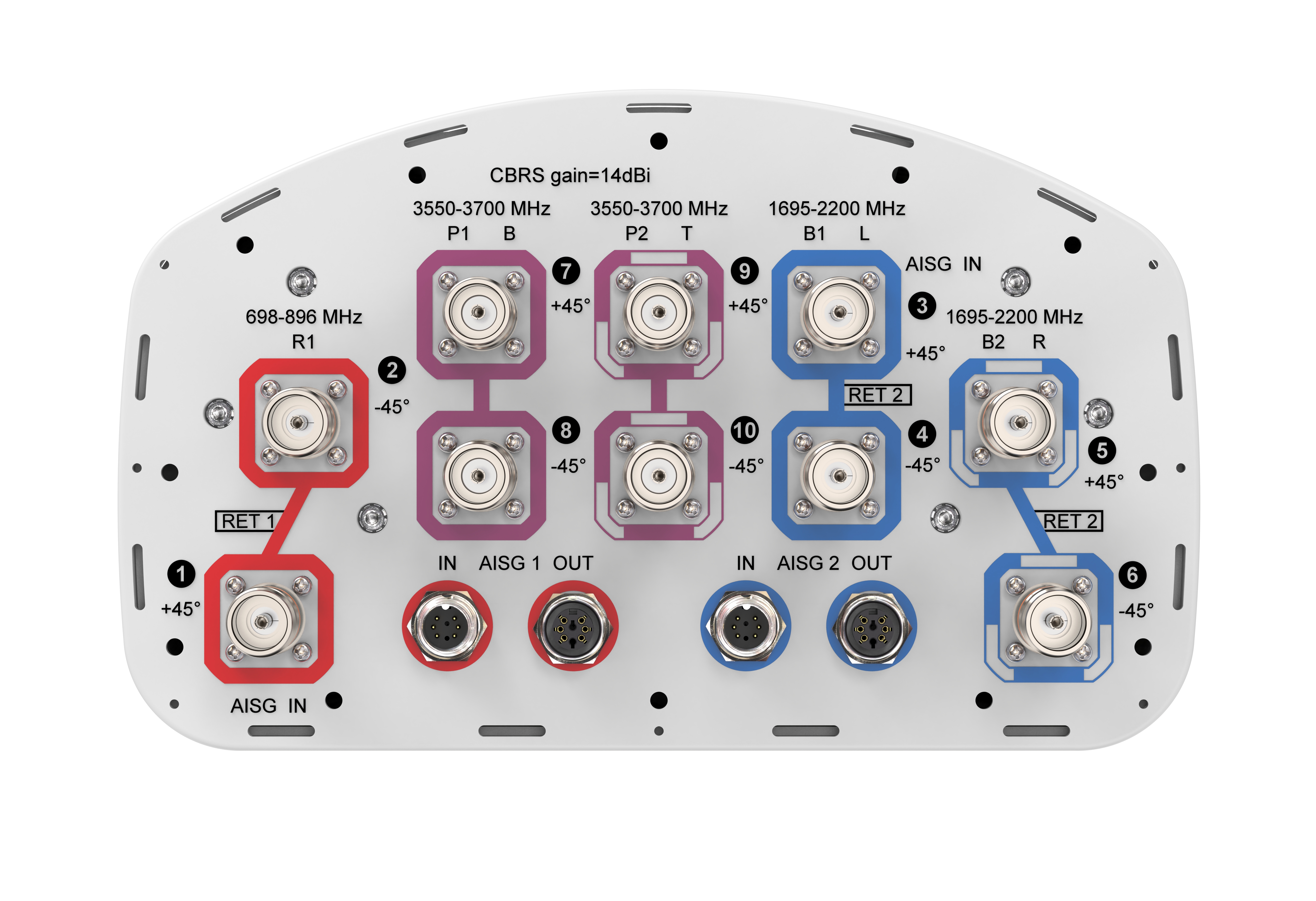 10-port sector antenna 2x 698-896, 4x 1695-2200 and 4x 3550-3700 MHz, 65° HPBW, 2x RETs and 2x SBTs.