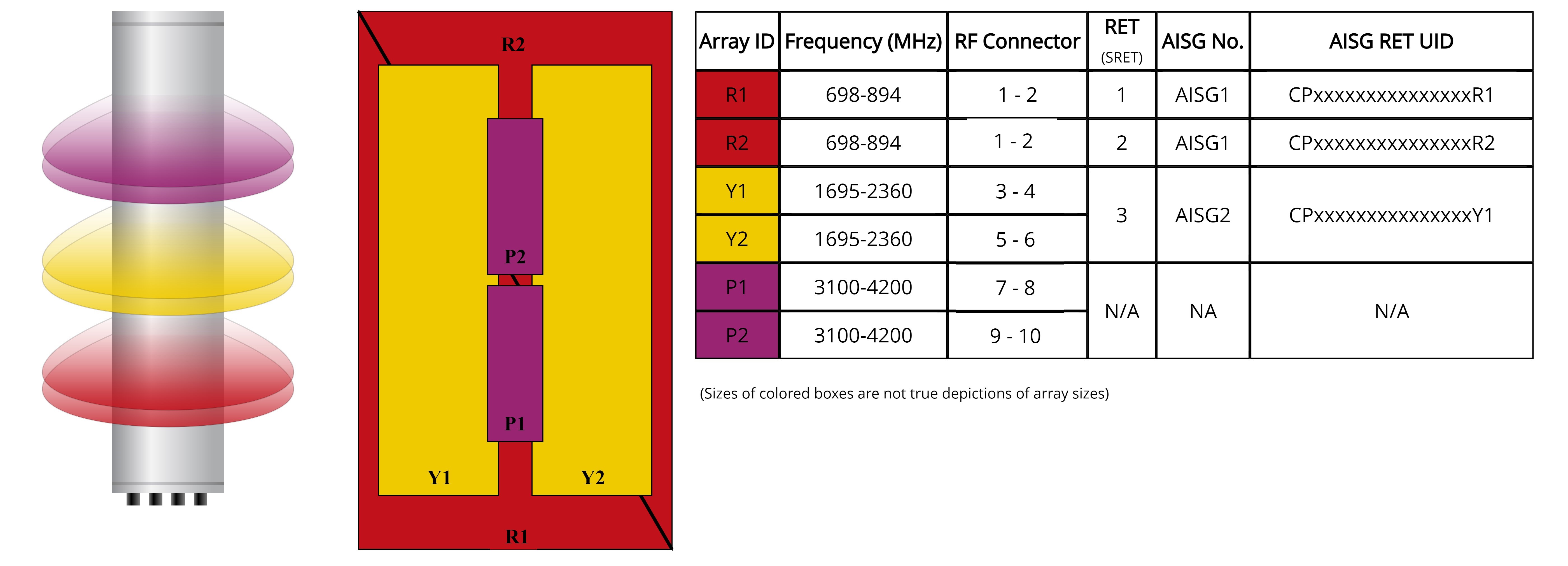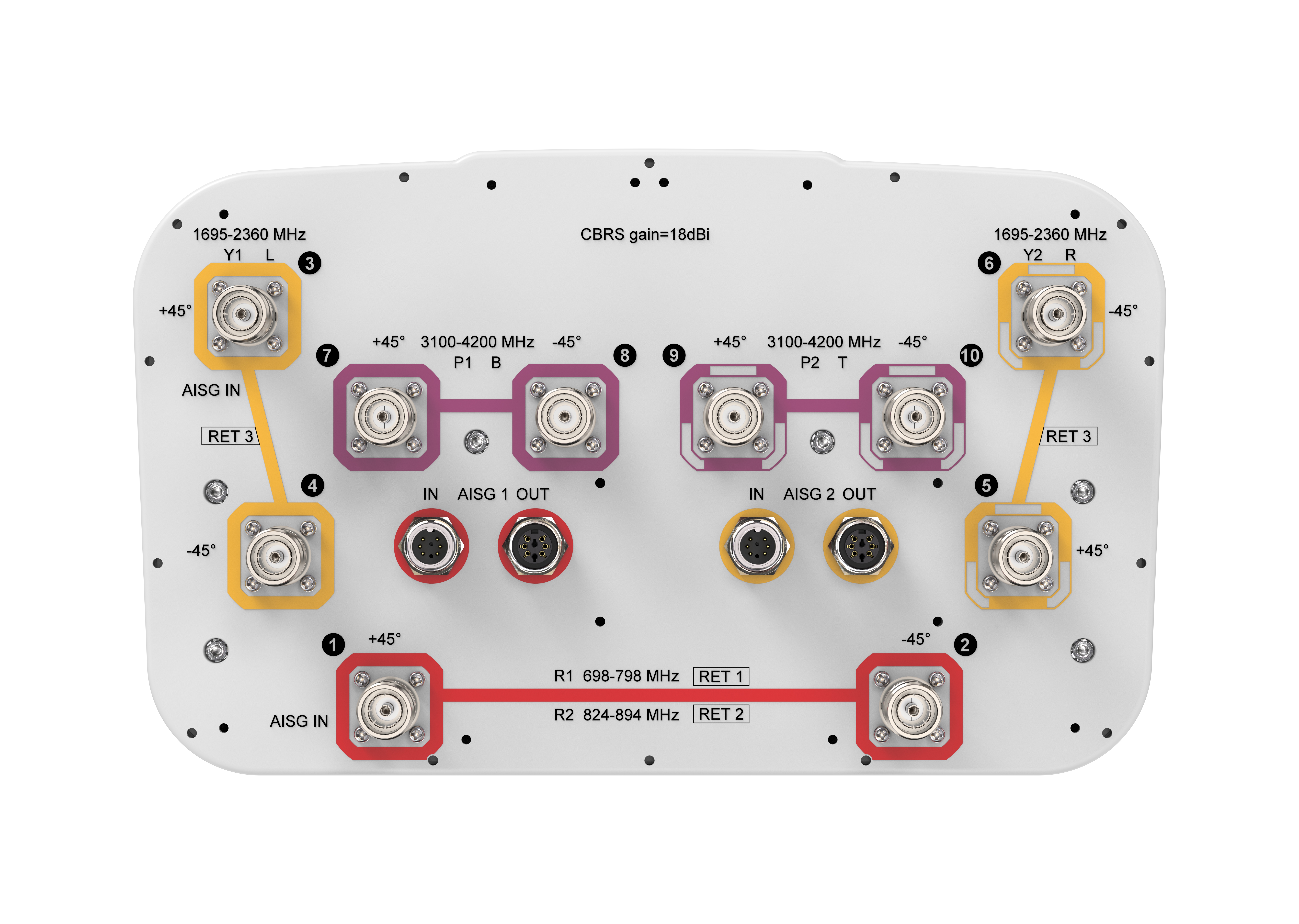 - Two LB RET and one MB RET. Both mid bands are controlled by one RET to ensure same tilt level for 4x MIMO