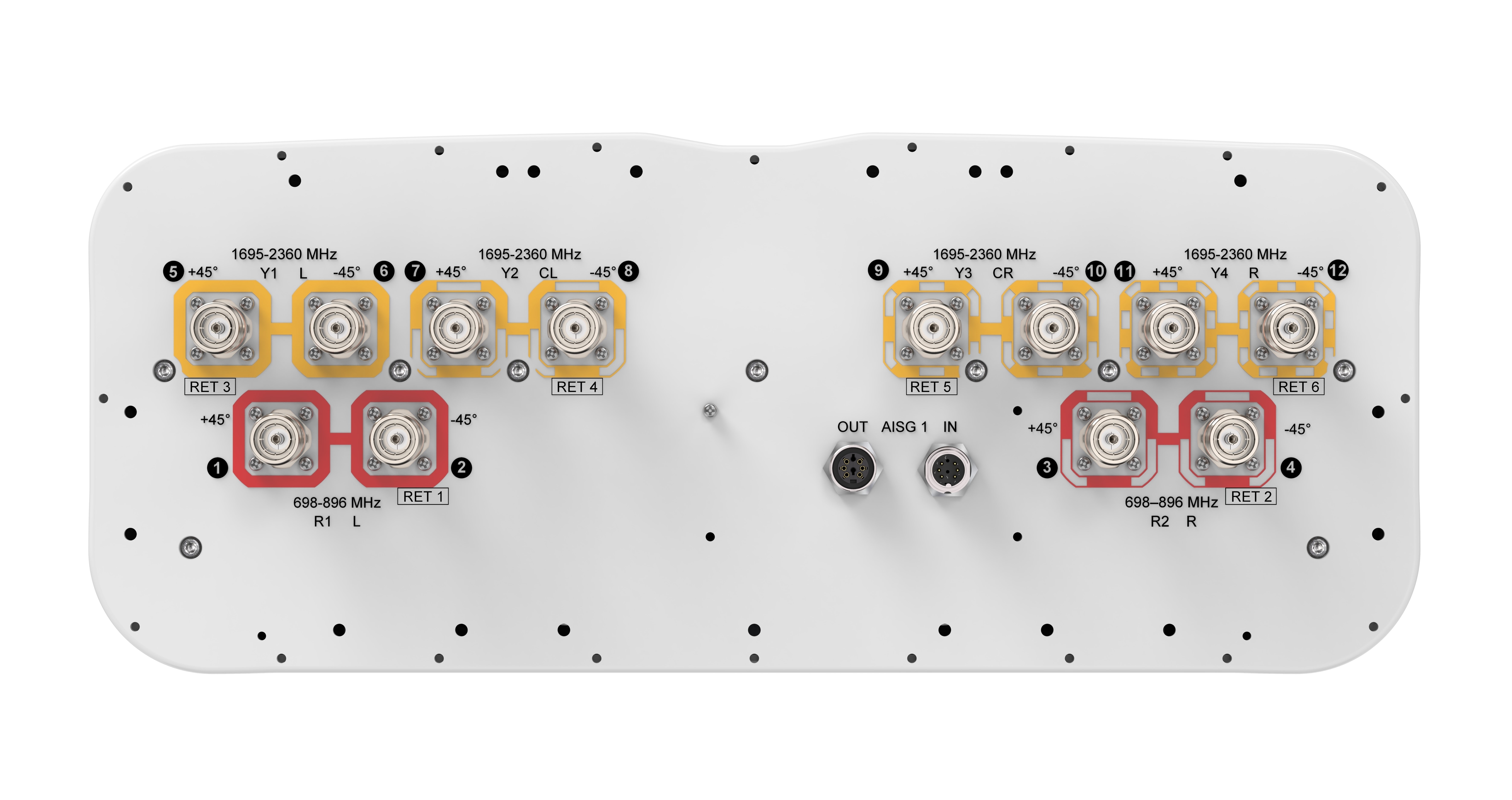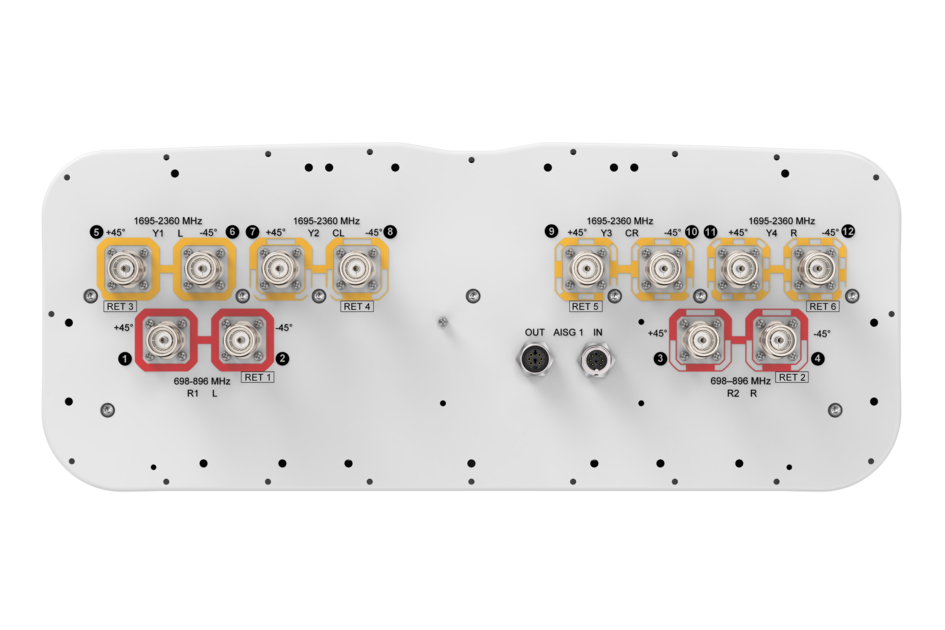 12-port sector antenna, 4x 698–896 and 8x 1695–2360 MHz, 65° HPBW, 6x RET.