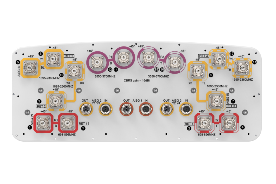 16-port sector antenna, 4x 698–896, 8x 1695–2360 and 4x 3550- 3700 MHz, 45° HPBW, 3x RETs and 3x SBTs.