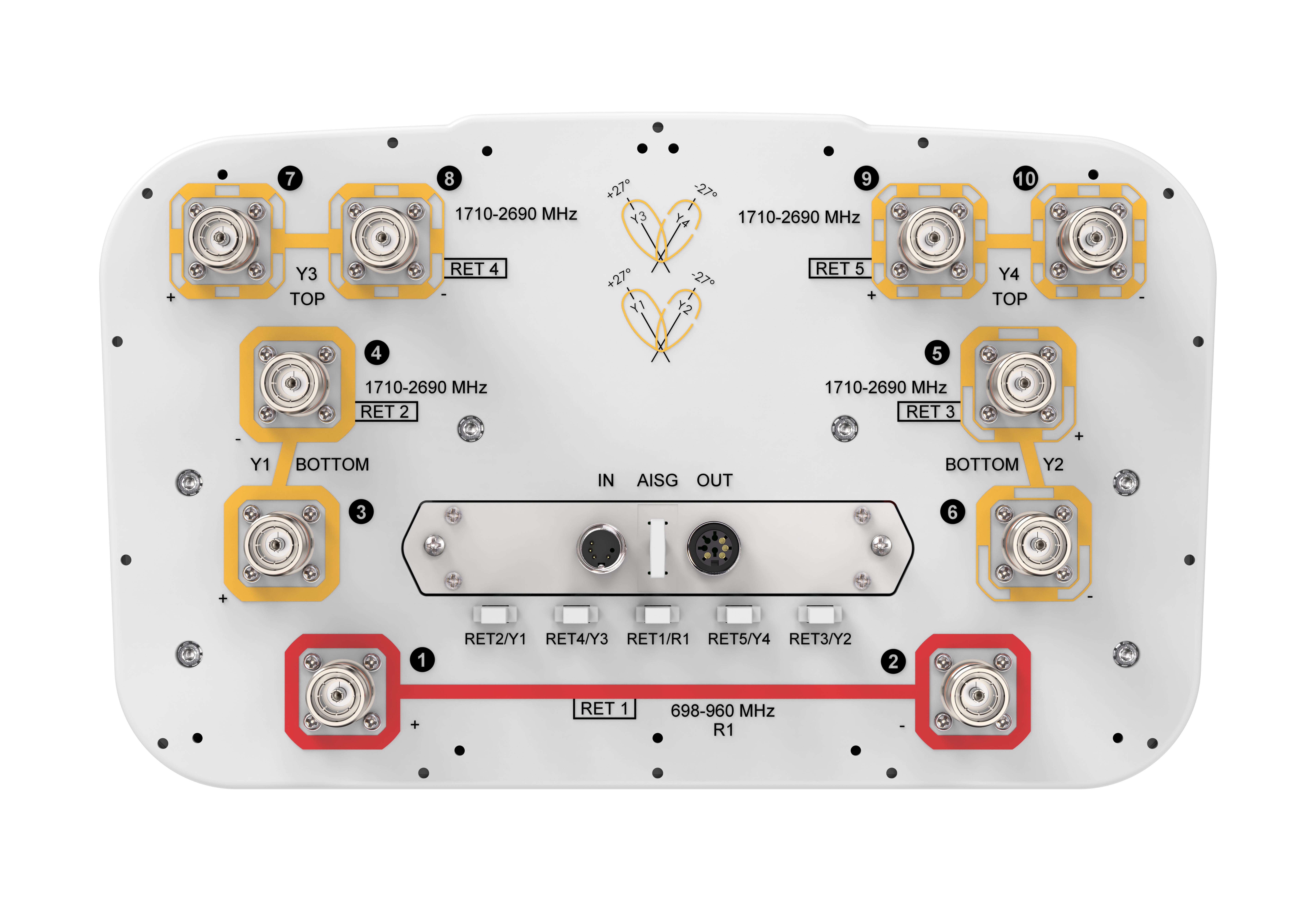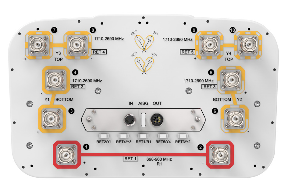 10-port sector/multi beam antenna, 2x 698-960 sector and 8x 1710-2690 multi beam, 65° sector and 33° 4x multi beam, 5x RET with tilt indicators