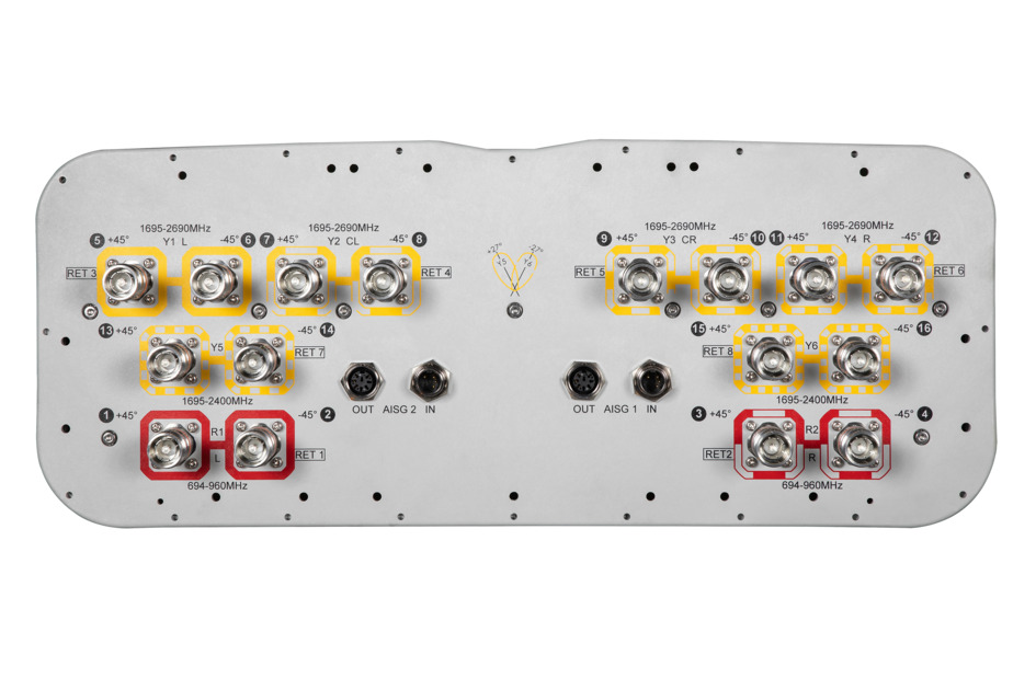 16-port sector antenna, 4x 694–960 and 8x 1695-2690 MHz 65° HPBW and 4x 1695-2400 MHz 2x 33° HPBW, 8x RET.