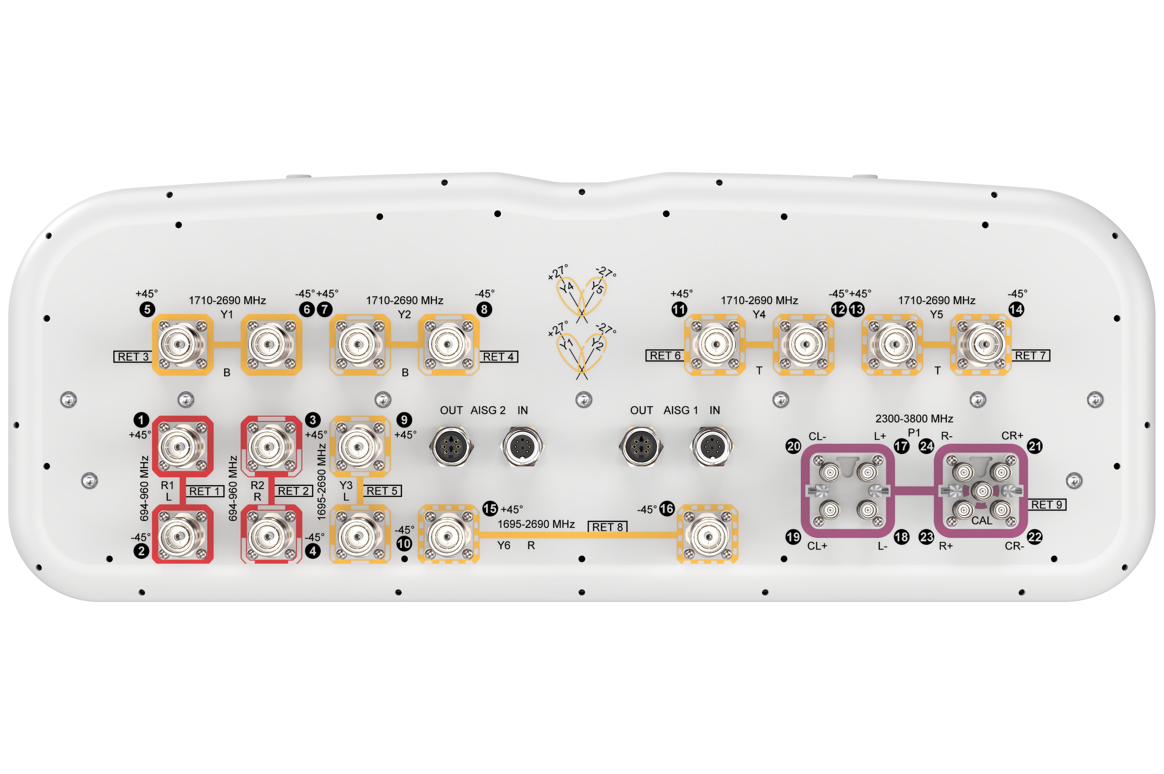 24-port sector/multibeam antenna, 4x 694–960, 4x 1695-2690MHz 65° HPBW, 8x 1710-2690MHz 4x33° HPBW and 8x 2300-3800MHz, 90° HPBW 9x RET