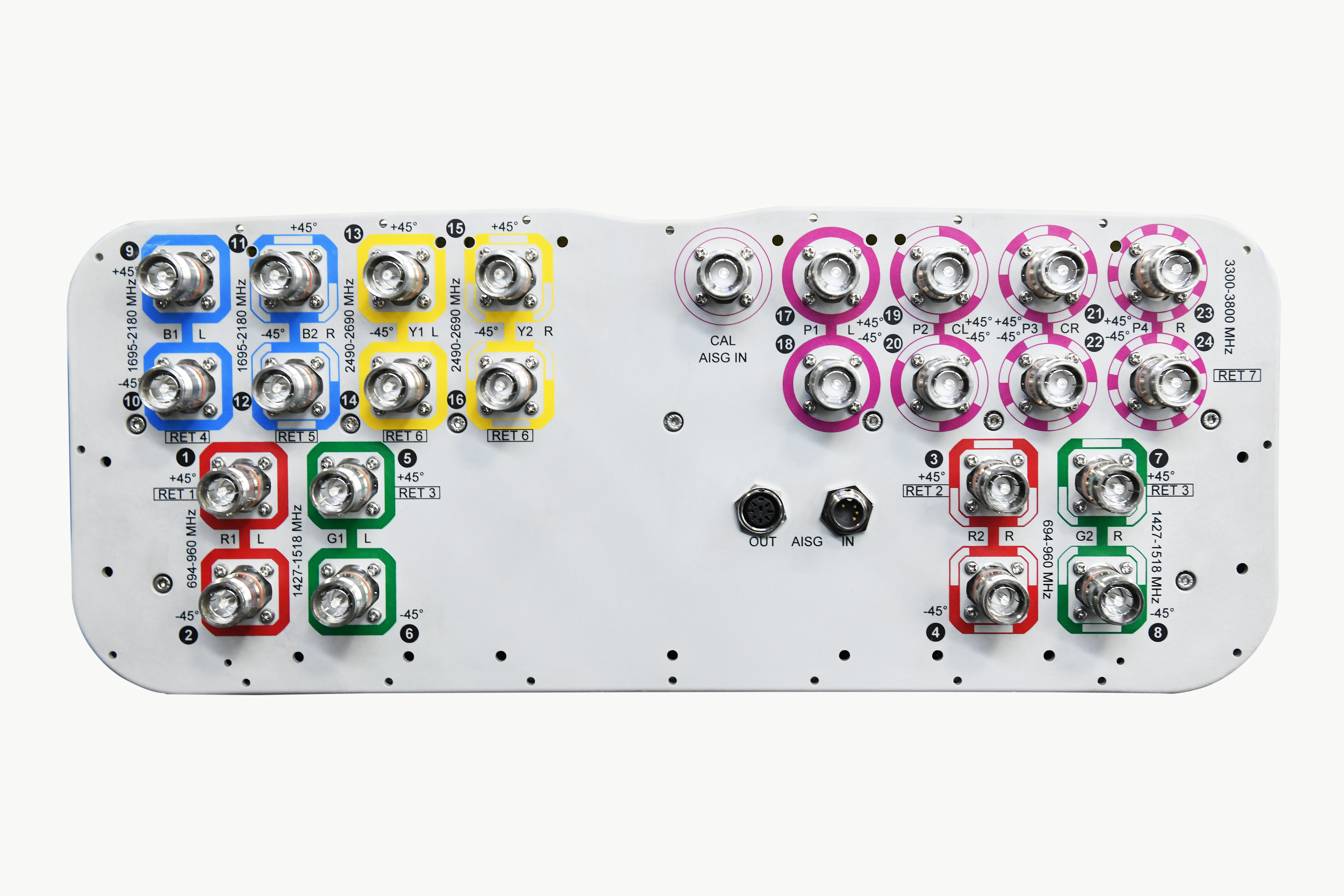 24-port sector antenna, 4x 694–960, 4x 1427–1518, 4x 1695-2180, 4x 2490-2690 65° HPBW and 8x 3300-3800 MHz, 7x RET