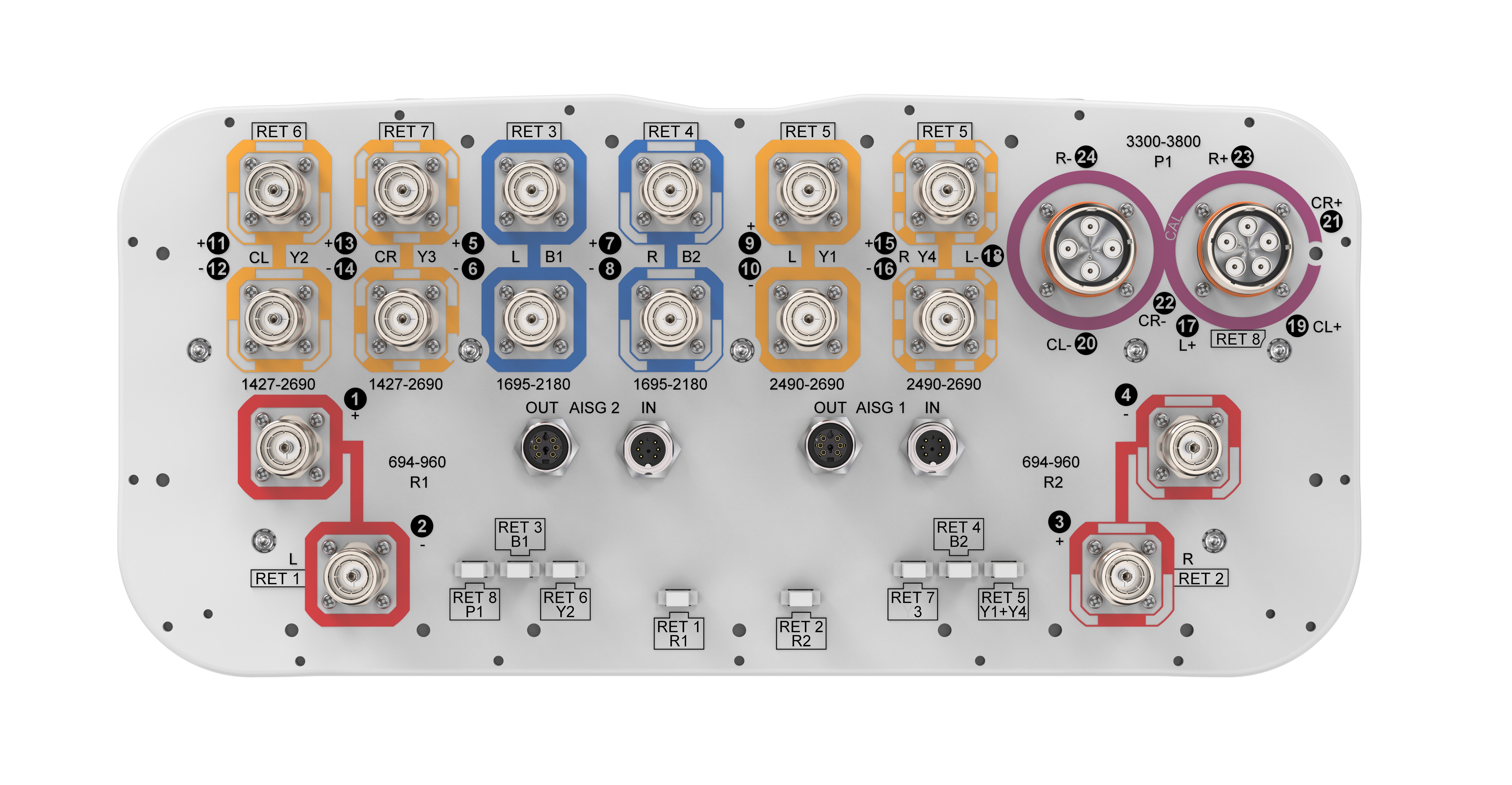 24-port sector antenna, 4x 694-960, 4x 1427-2690, 4x 1695-2180, 4x 2490-2690 and 8x 3300-3800 MHz, 65° HPBW, 8x RET