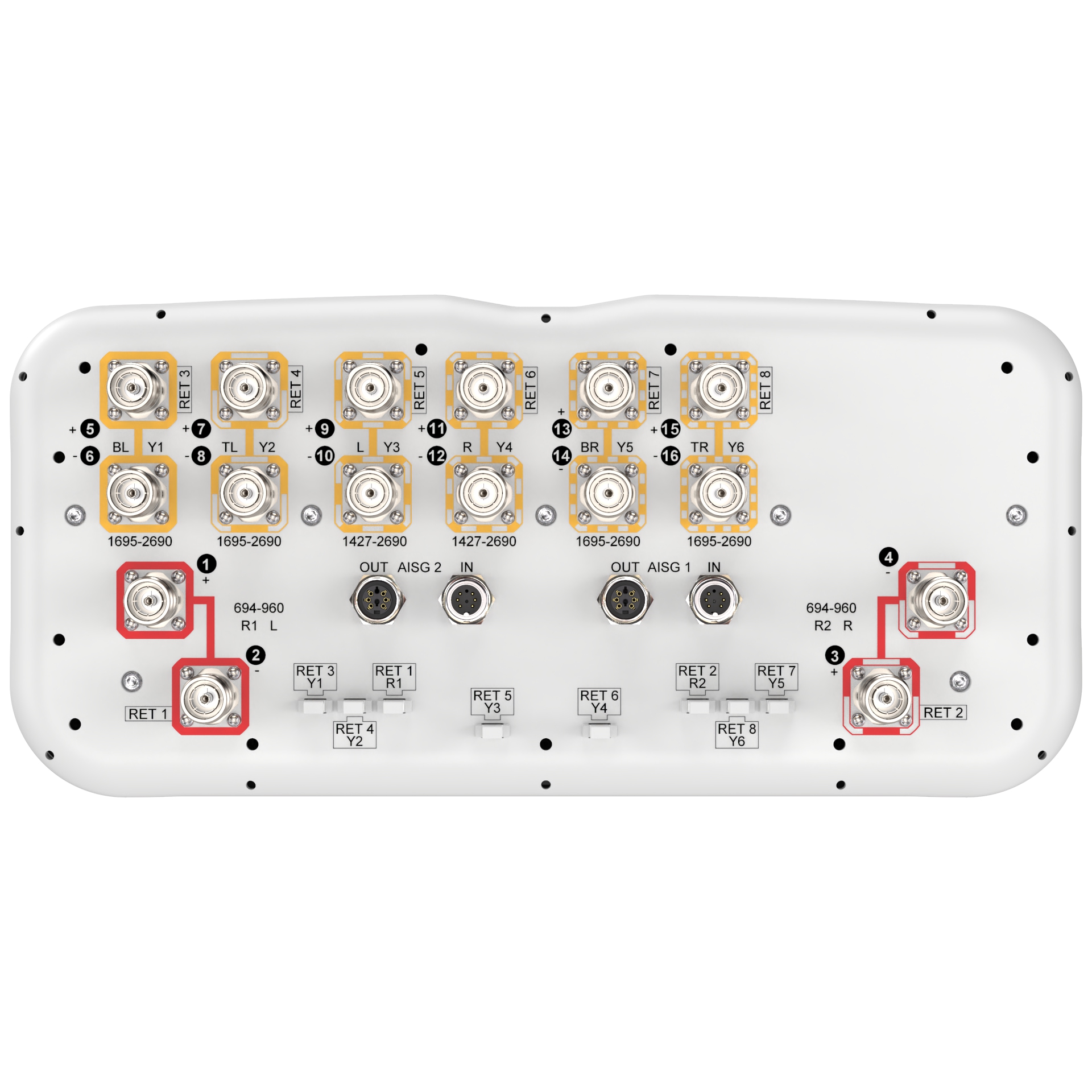 16-port sector antenna, 4x 694-960, 4x 1427-2690, and 8x 1695-2690 MHz 65° HPBW, 8 x RET