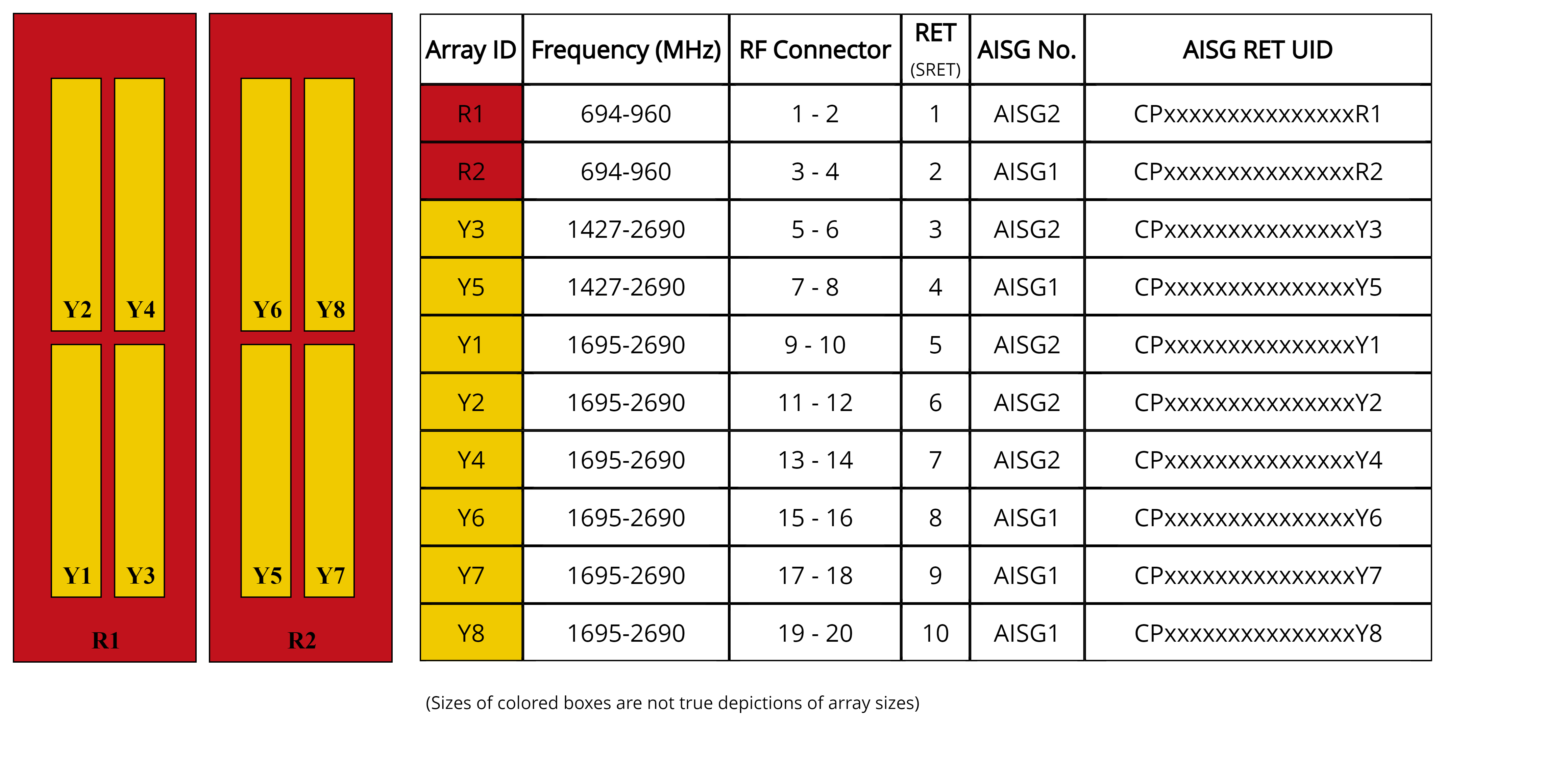 • RET configuration is factory pre-set for antenna sharing - RET 1, 3, 5, 6, 7 assigned to AISG 2 and RET 2, 4, 8, 9, 10 assigned to AISG 1