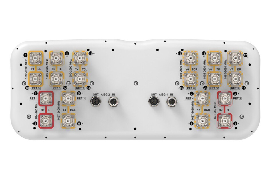 20-port sector antenna, 4x694-960 (R1 & R2), 4x1427-2690 (Y3 & Y5) and 12 x 1695-2690 MHz (Y1/Y2/Y4/Y6/Y7/Y8), 65° HPBW, 10xRET
