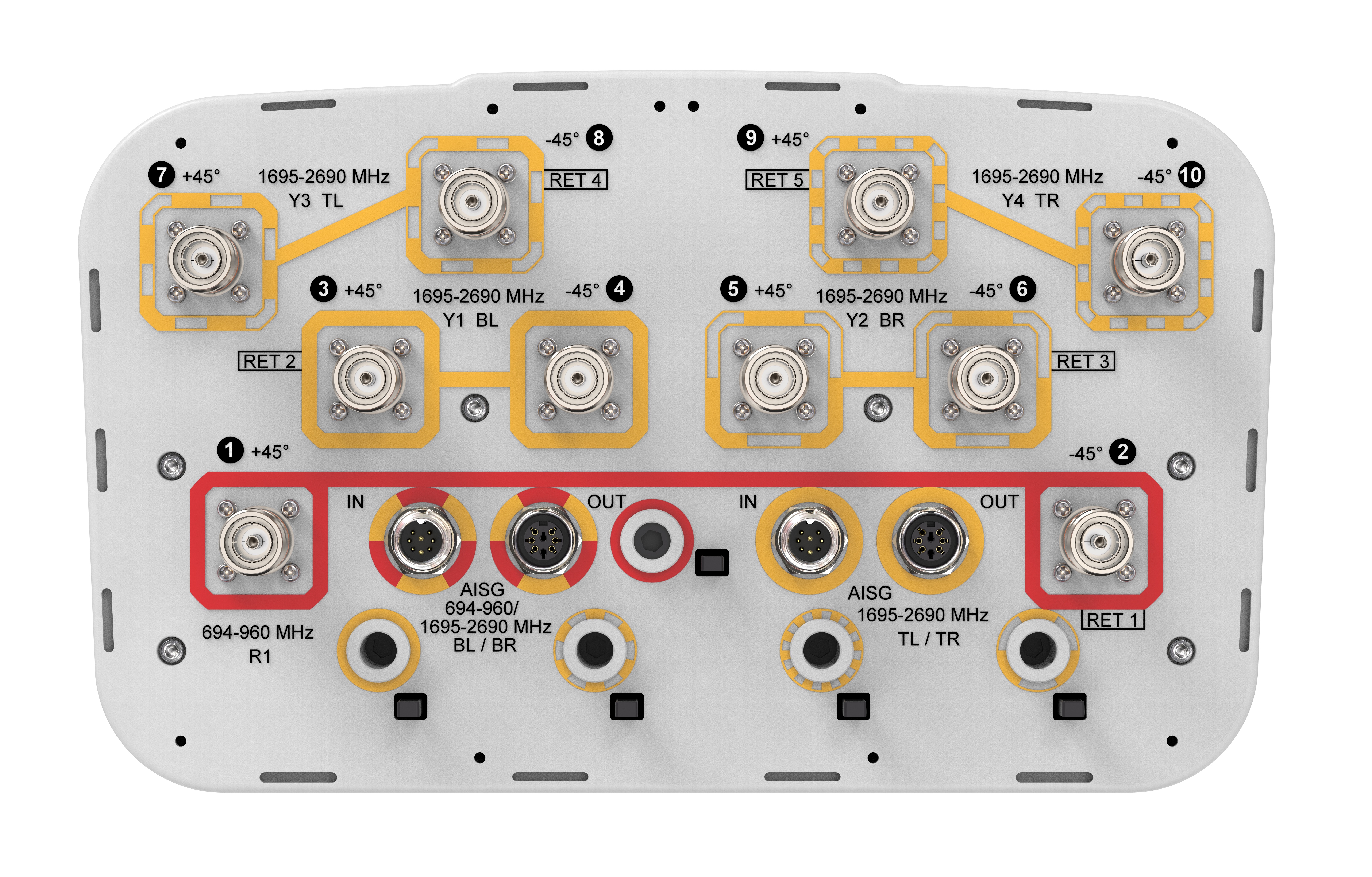 RET Interface 4x 8 pin connector as per IEC 60130-9 Daisy chain in: Male / Daisy chain out: Female Pin3: RS485A(AISG_B), Pin5: RS485B(AISG_A), Pin6: DC 10~30V, Pin7: DC_ Return