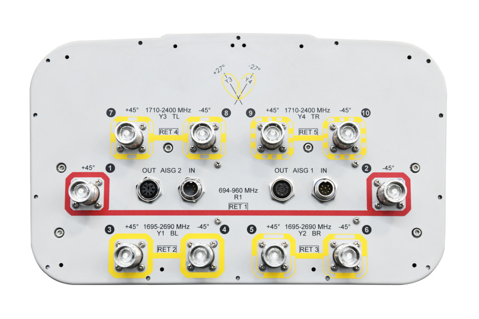 10-port sector antenna, 2x 694–960 and 4x 1695-2690 MHz 65° HPBW and 4x 1710-2400 MHz 2x 33° HPBW, 5x RET.