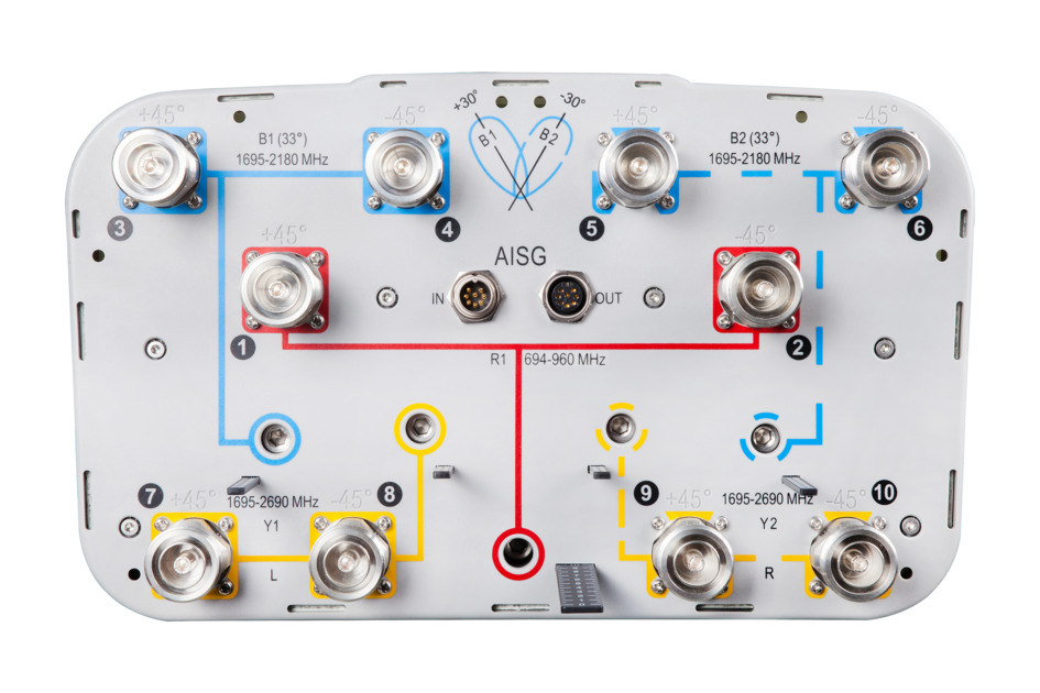 10-port sector antenna, 2x 694–960 MHz 65° HPBW, 4x 1695-2690 MHz 65° HPBW and 2x 1695-2180 MHz 2x 33° HPBW, 5x RET with manual override. Bands cascaded SRET