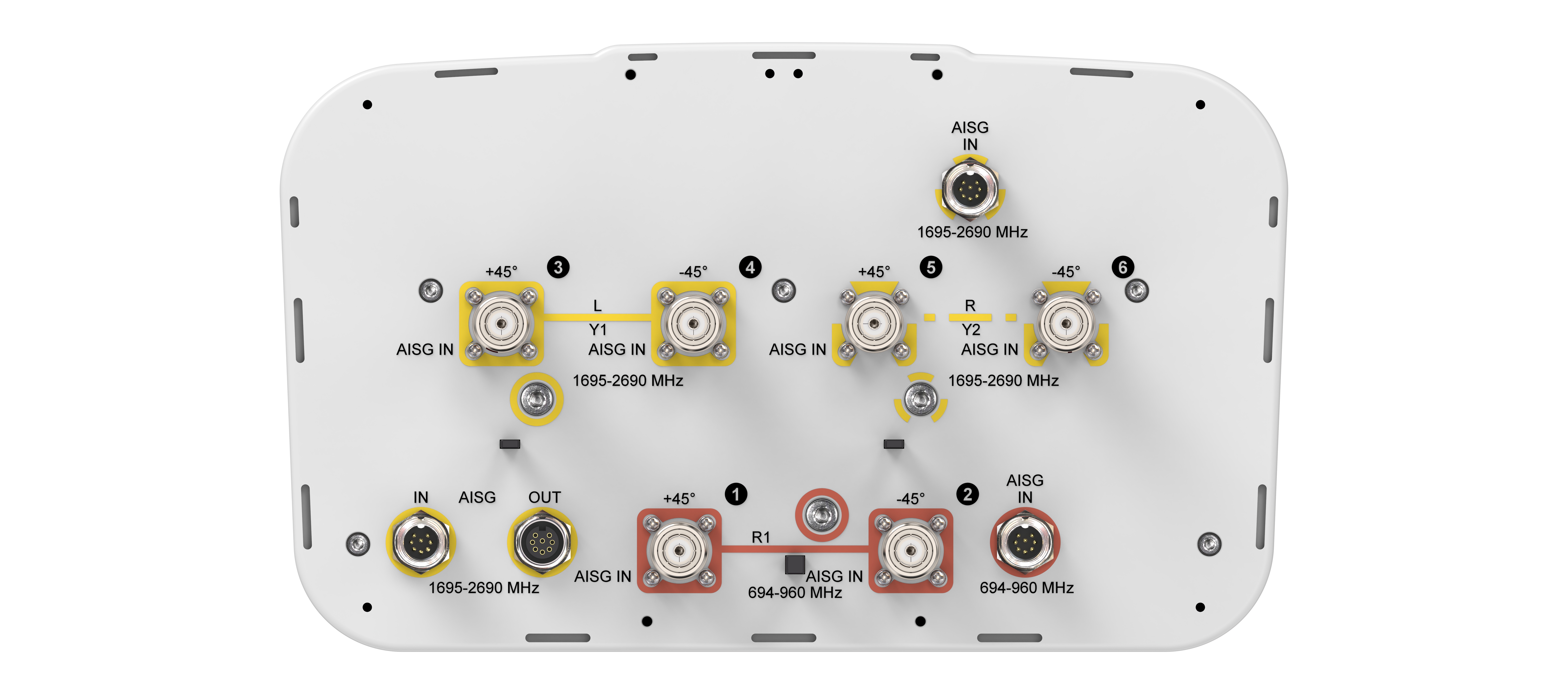 - Internal RET actuators are connected in SRET configuration, with dedicated AISG ports for each band