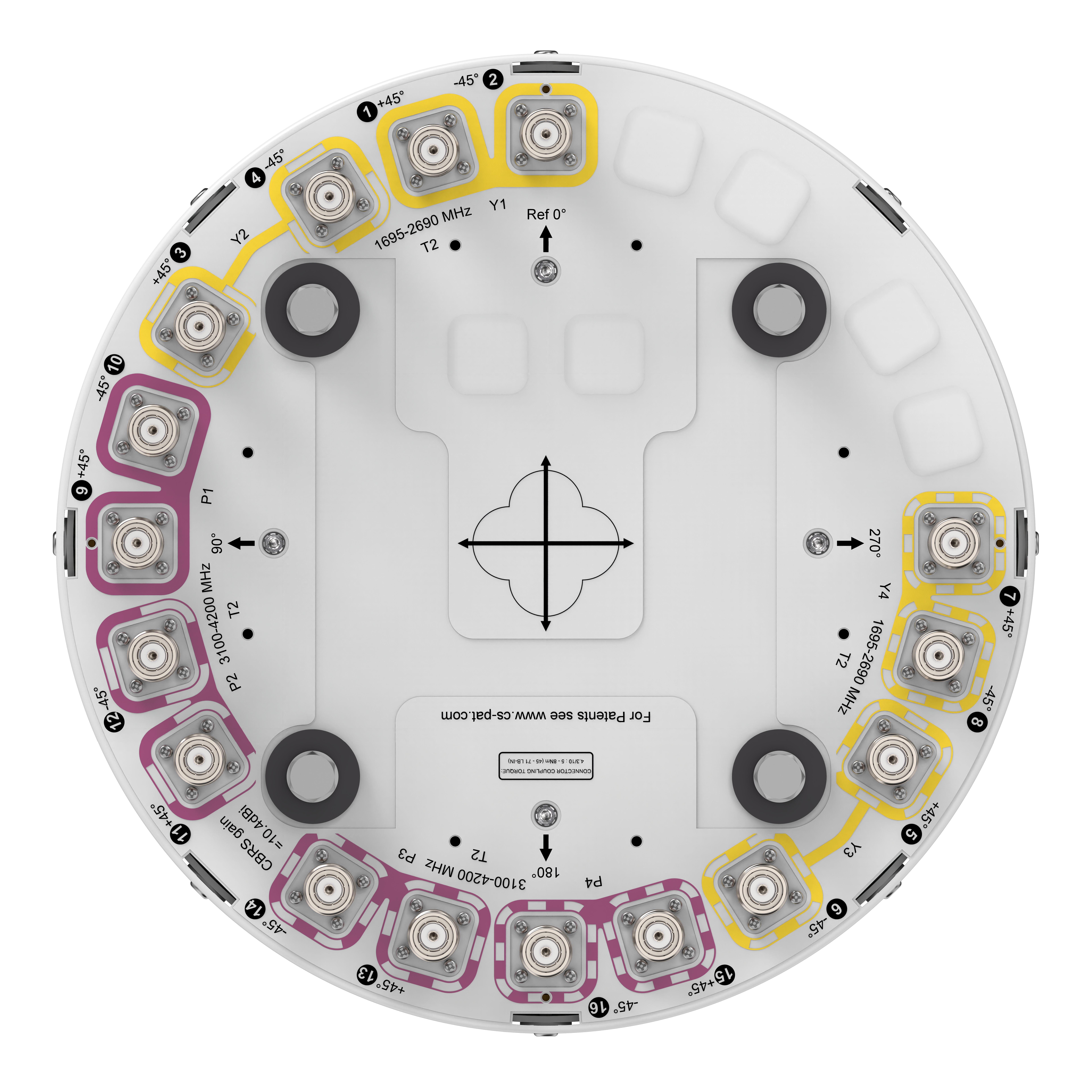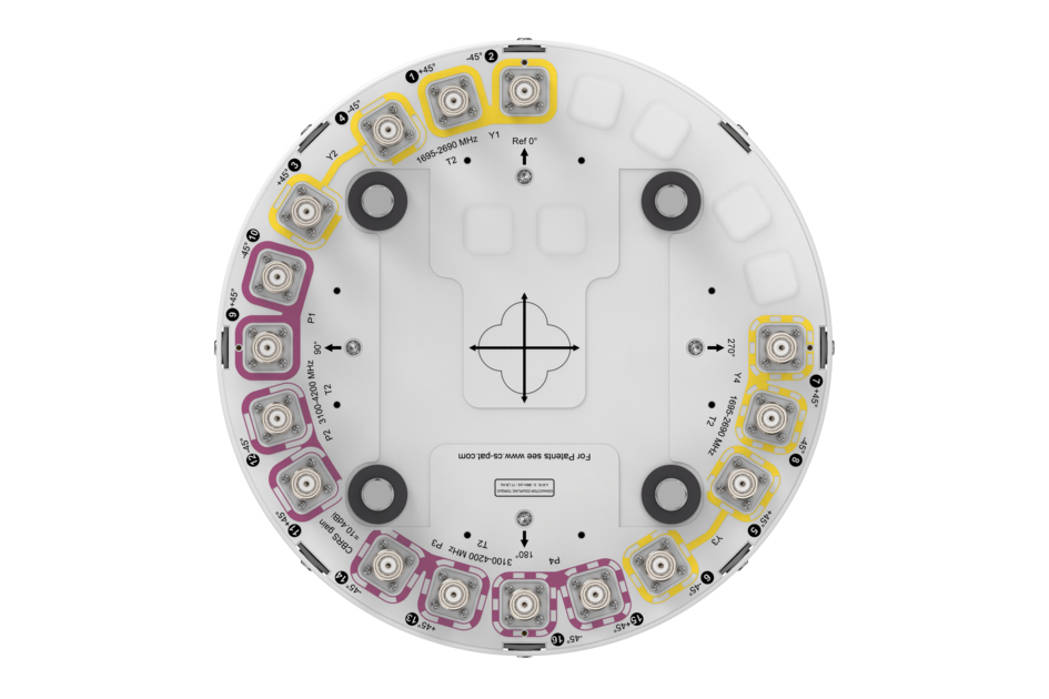 16-port small cell antenna, 8x 1695-2690, 8x 3100-4200 MHz, 360° Horizontal Beamwidth, fixed tilt.