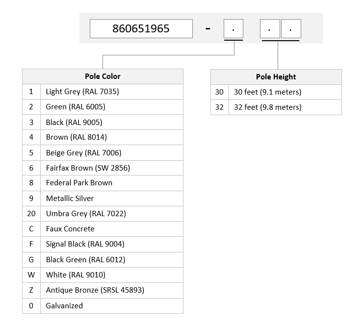 | Pole Height Options | 9.144 m | 30 ft | 9.754 m | 32 ft |