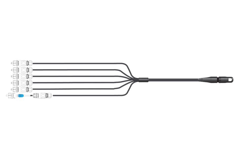 .HELIAX® Discrete, outdoor rated, single mode fiber cable assembly, End 1: Uniboot LC. End 2: OptiTip Compatible connector (Plug). At End 1, pre-install weatherproof shroud (EAS shroud) which can provide IP65 rating for spare branch protection.
