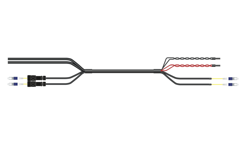 HELIAX® Hybrid Cable Assembly, BiDi, 6-OVP box to RRU, UL Type TC-ER, 4 power conductors 10 AWG at OVP, 2 power cords 8 AWG at RRU, 2 Simplex fiber connectors, FullAXS, PVC jacket, aluminum armor, OVP gland insert kit included