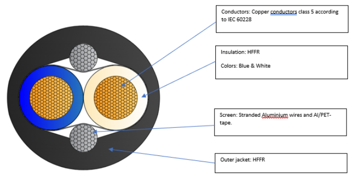 HELIAX® Power cable, with aluminum shield and qty 2 6mm2 cores, flame resistant CPR Class B2ca s1, d2, a1, 500 meters. Voltage Rating Maximum AC0.6KV Voltage Drop 3.82 mV/A/m Conductor, cross-sectional area 2.5 mm2