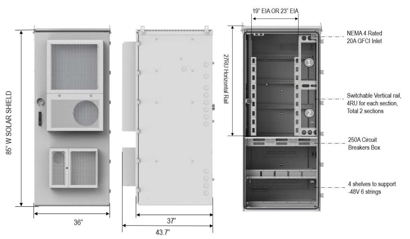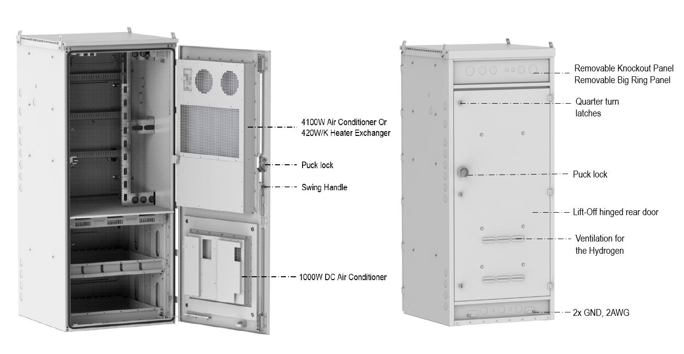 The cabinet is designed to combine wireless telecom power equipment and VRLA batteries into one cabinet. Equipment ranges from DC power system, Fiber slack tray, cell site router and other servers equipped by customer. This cabinet provide mechanical and environmental protection for the equipment inside. Cooling of active equipment is achieved by DC rated 4100W Air Conditioner. Provide the 1000W Air Conditioner cooling solution for VRLA battery compartment.