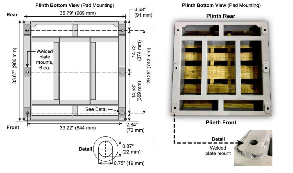 The plinth is designed to mount and elevate the CMC74-36 and CMC85-36 large footprint cabinet by 6". It uses the same ½” hardware from ANDREW and is constructed entirely out of steel to support all CMC74-36 and CMC85-36 series large footprint cabinets.