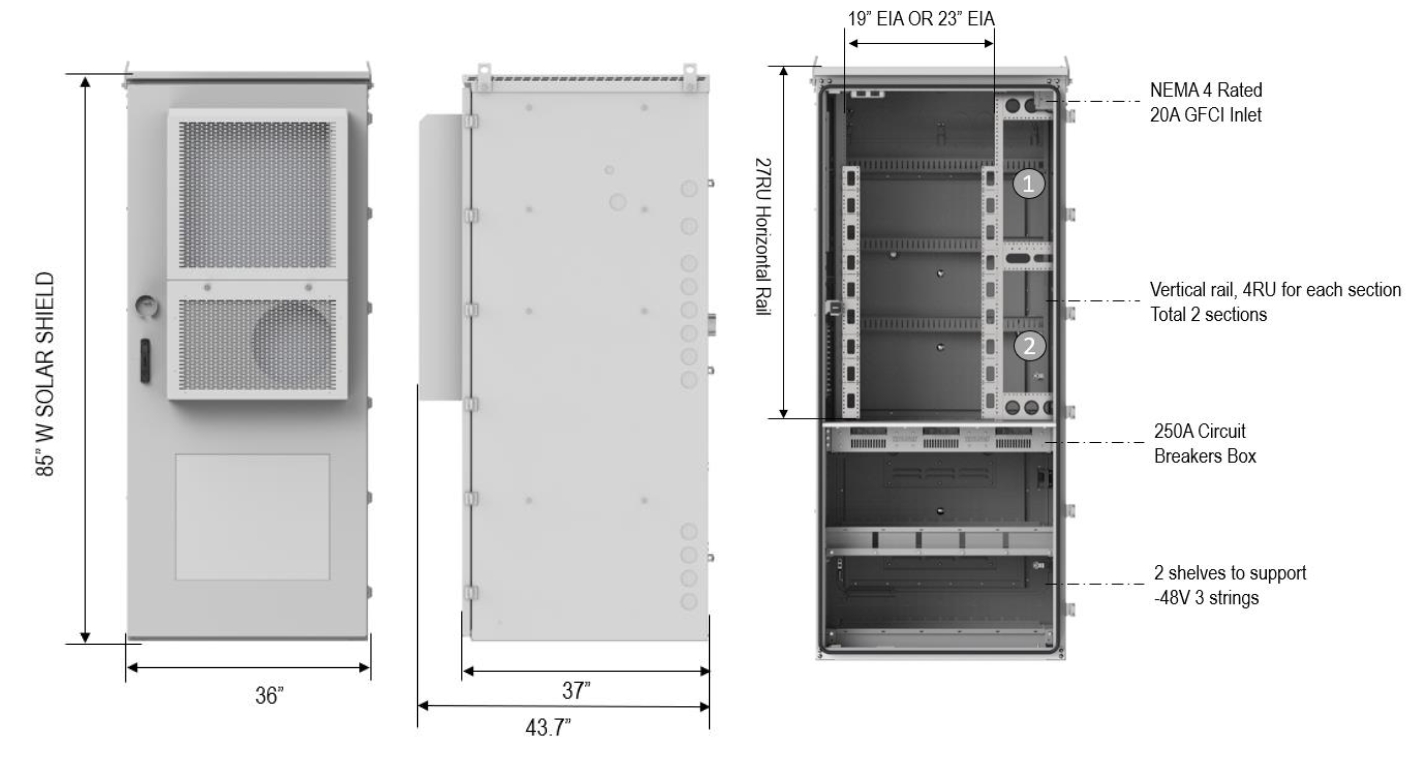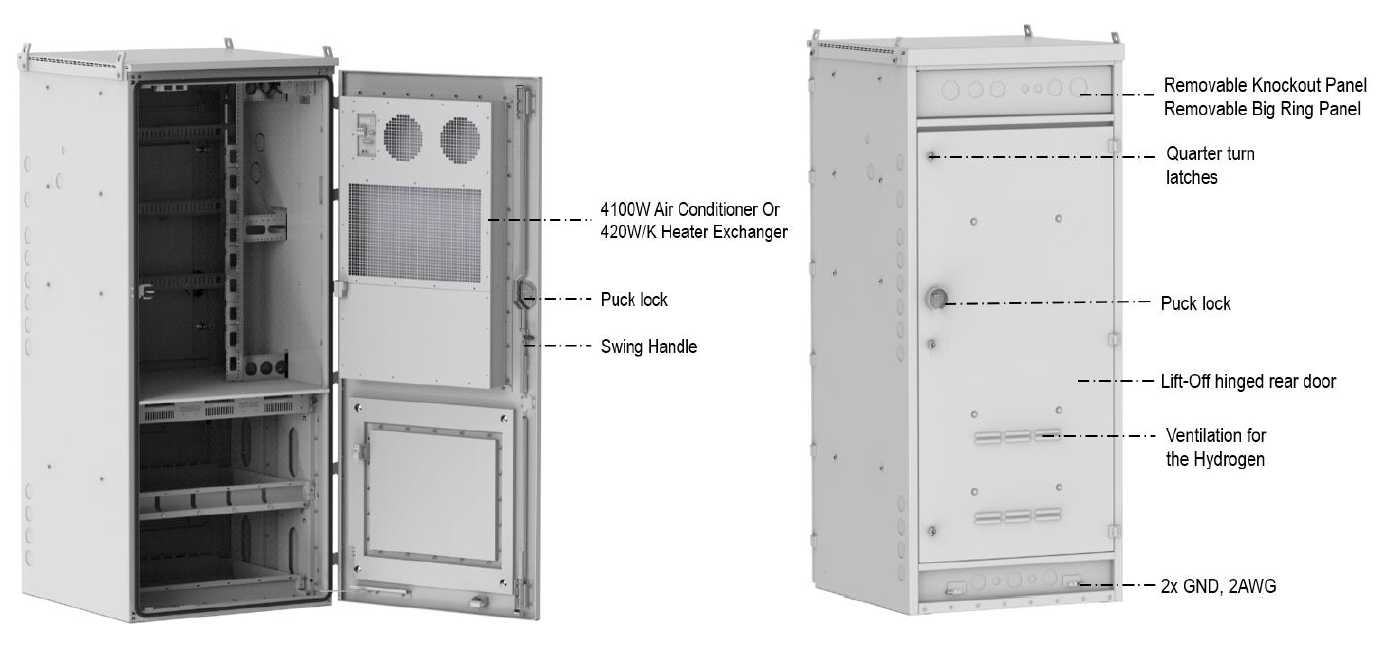 The cabinet is designed to combine wireless telecom power equipment and NiCad batteries into one cabinet. Equipment ranges from DC power system, Fiber slack tray, cell site router and other servers equipped by customer. This cabinet provide mechanical and environmental protection for the equipment inside. Cooling of active equipment is achieved by DC rated 4100W Air Conditioner.