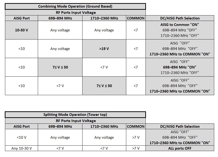 | dc/AISG Pass-through, combiner | dc Sensing |