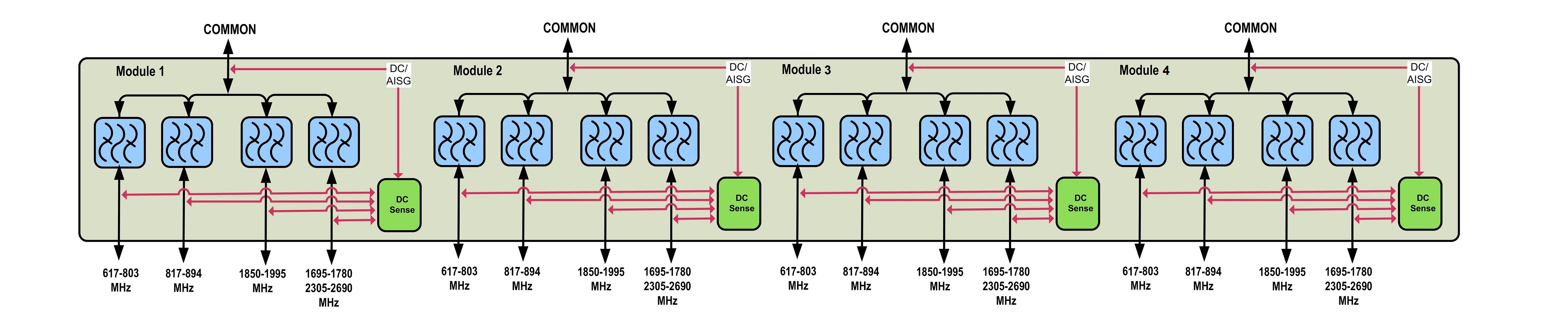 Quad Quadplexer, 600/800/PCS/AWS+WCS+BRS, DC Sense, 4.3-10