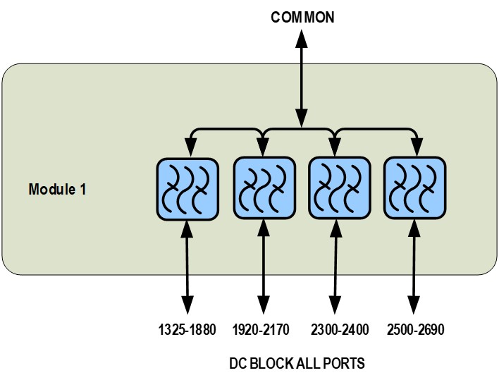 Single Quadplexer 1325-1880//2100//2300//2600 MHz, DC Block, with 4.3-10 connectors
