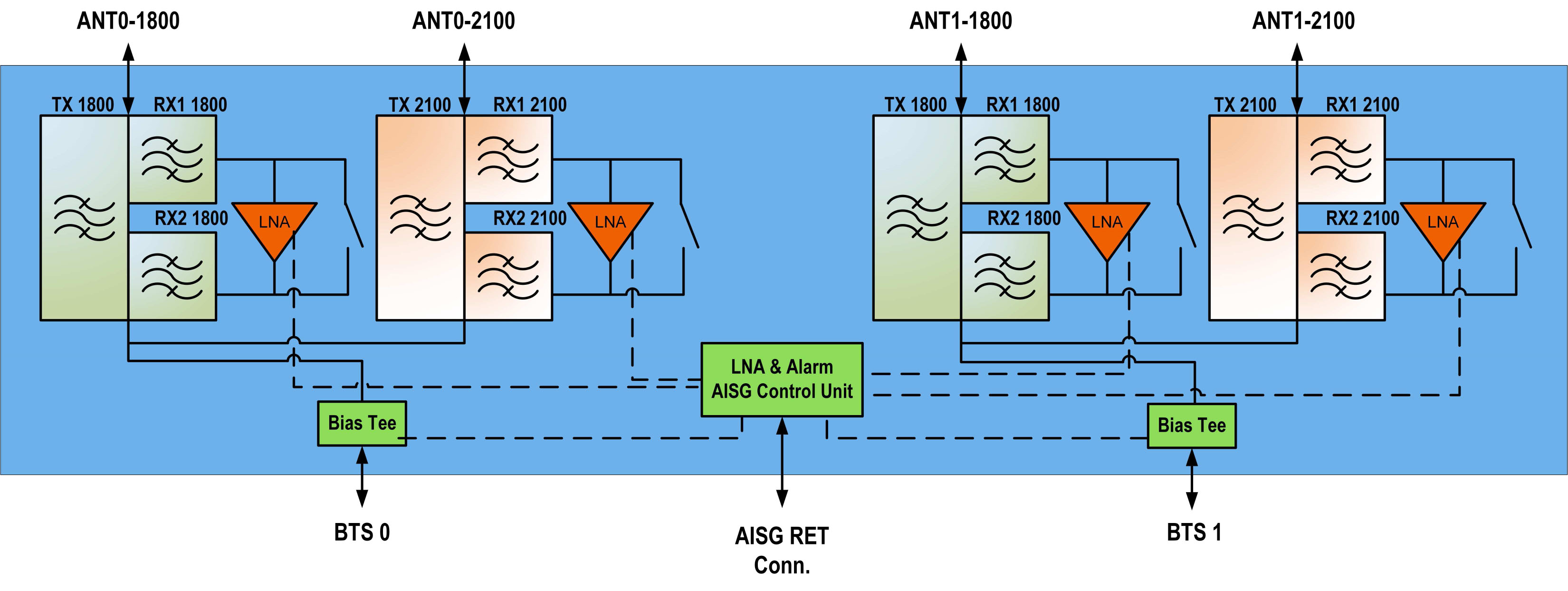 Dual Band Tower Mounted Amplifier, 1800//2100 MHz, 12 dB, 2 BTS & 4 ANT ports, AISG with 1 RET connectors (1 devices with 2 sub-units each)