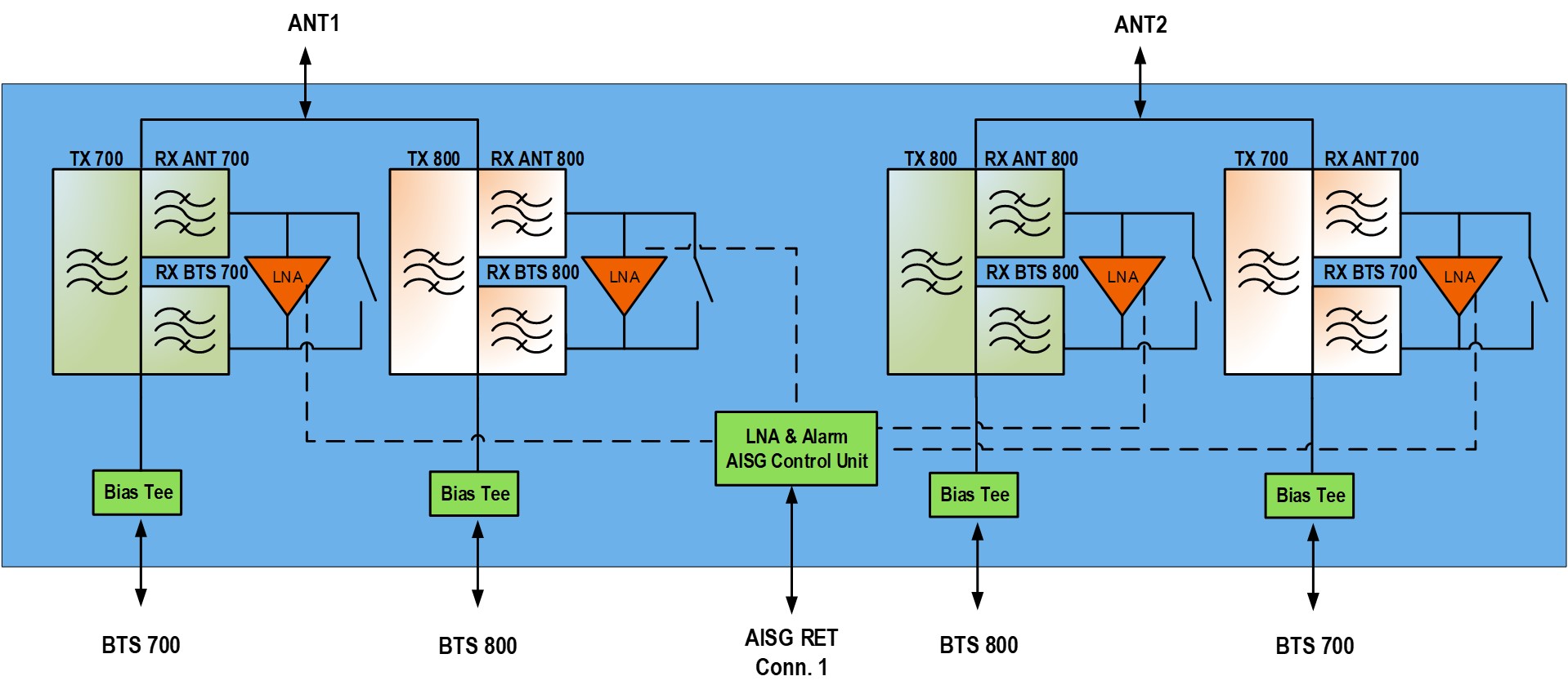 Dual Band Tower Mounted Amplifier, 700/800 MHz, 12 dB, 4 BTS & 2 ANT ports, AISG with 2 RET connector, with 4.3-10 connectors (1 device with 2 sub-units)