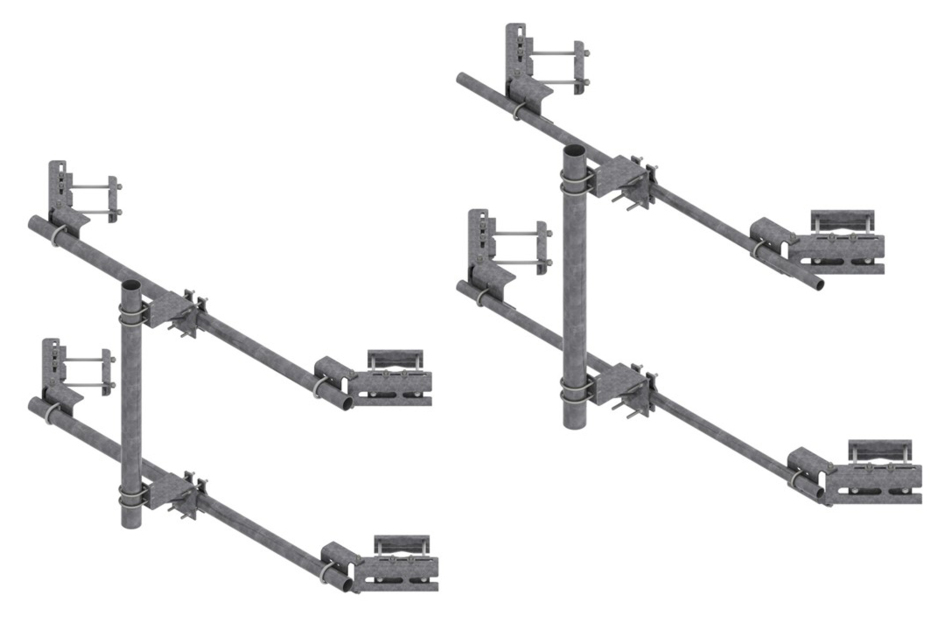 TF Series Tower Face Mounts, which are typically used for Microwave Dish Mounting are offered in 8’, 14’, or 20’ face widths with 2-3/8”, 3-1/2”, or 4-1/2” OD face pipe options. These kits can accommodate a range of MW dish sizes from 2’ to 15’ diameter.